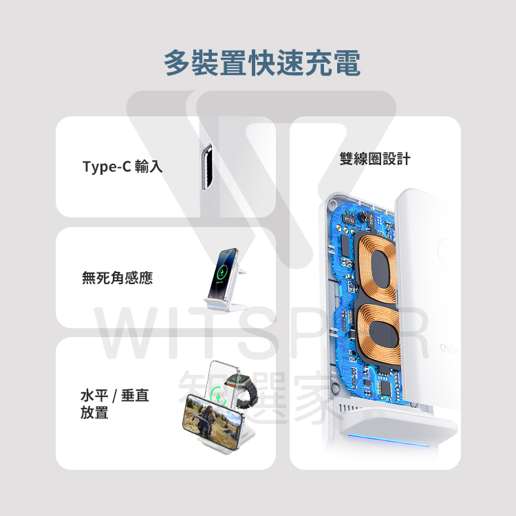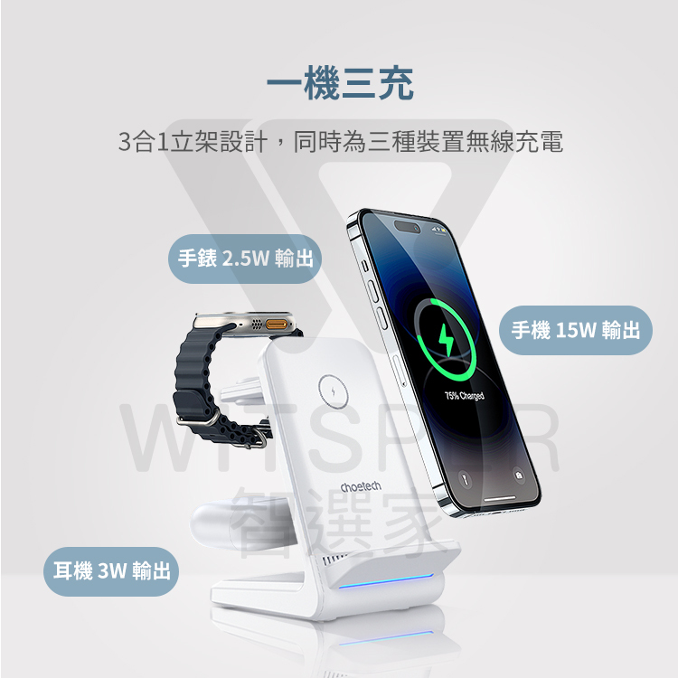 快速充電 無需等待:支援最高手機 15W/手錶 2.5W/耳機 3W 充電