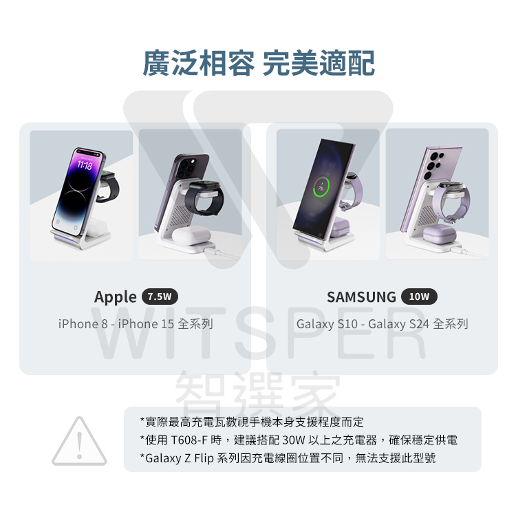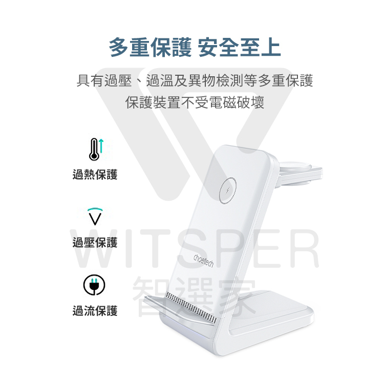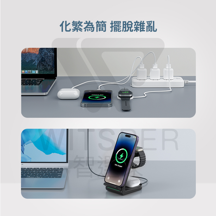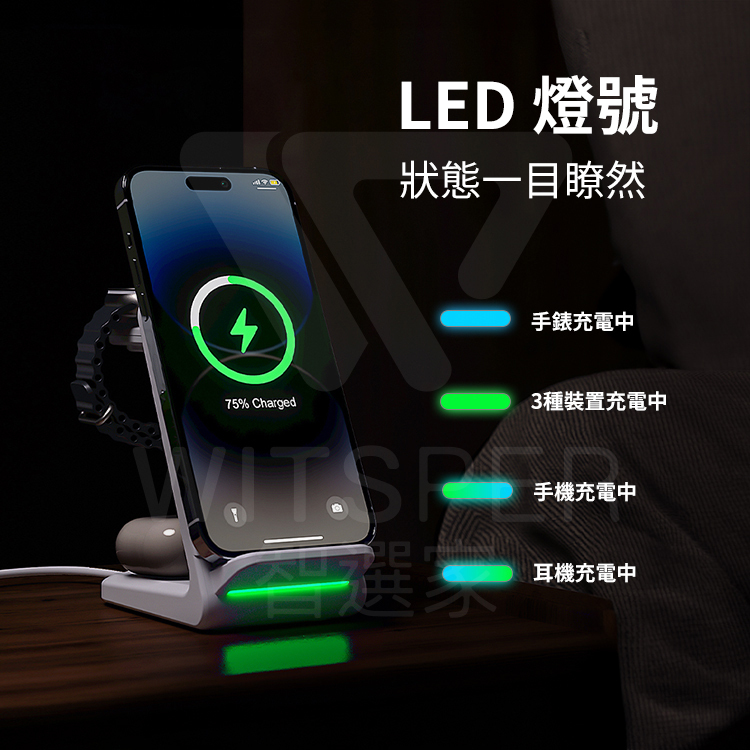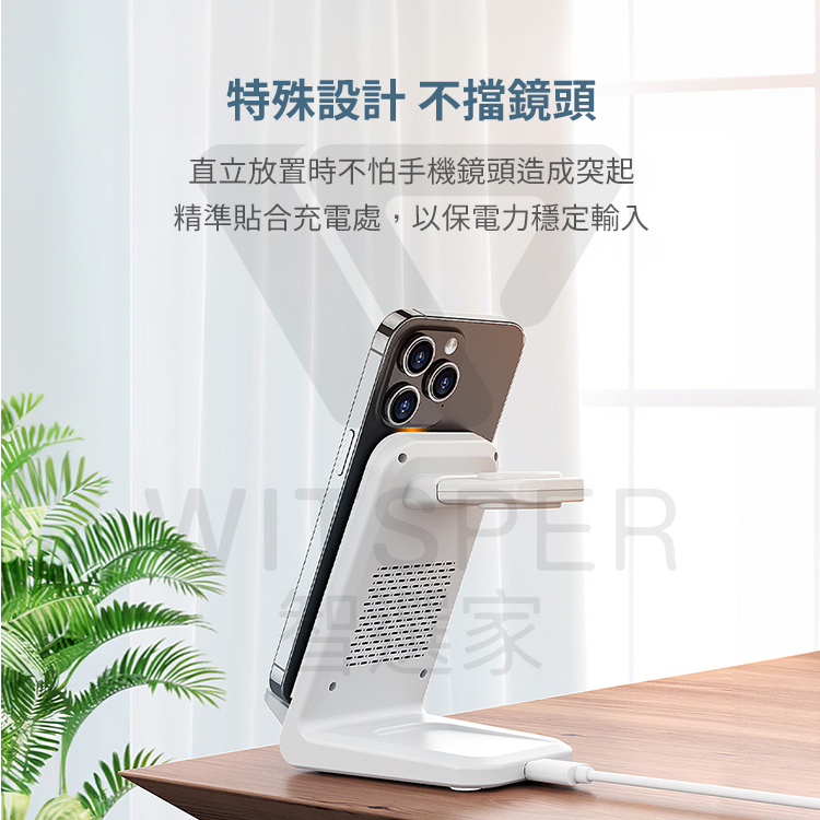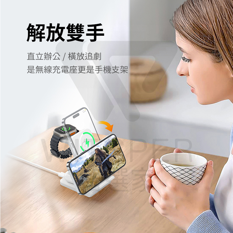 一機三充 高效有序:3合1立架設計,同時為手機、耳機、智慧手錶等三種裝置無線充電