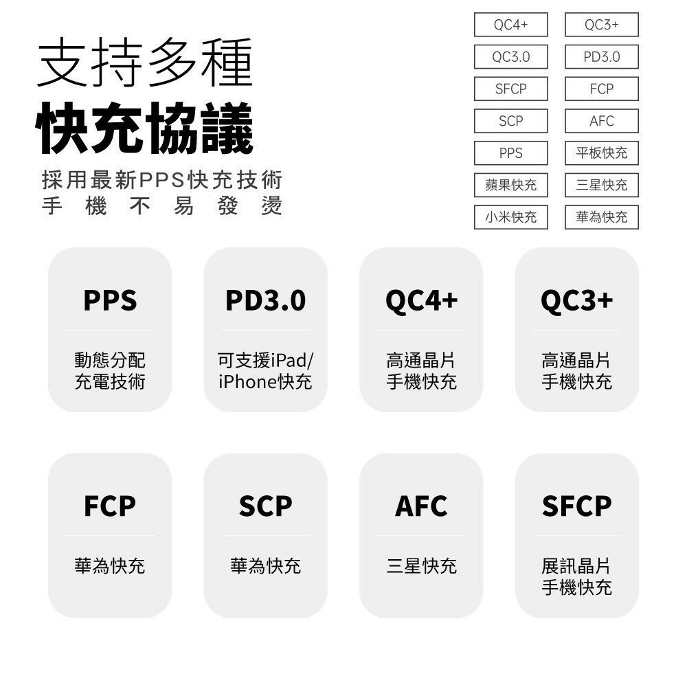 ◎ 快充技術:支援PD3.0/QC4+/AFC/FCP快充協議,同時搭載PPS動態分配充電技術