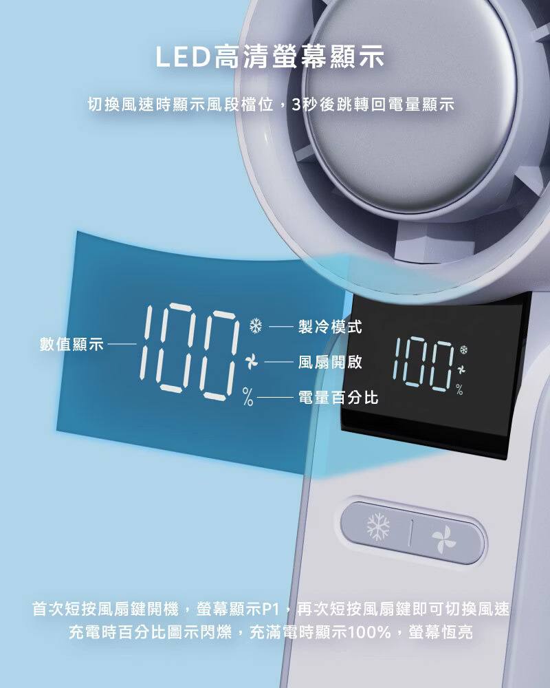 ・LED顯示螢幕,電量/模式/風速顯示一目瞭然