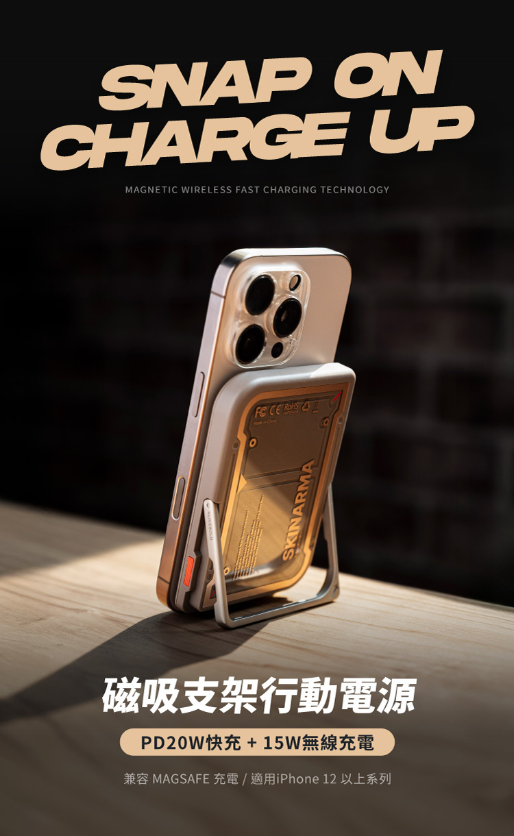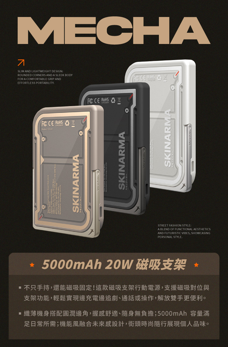 兼具高效能與設計感,MECHA 5000mAh 磁性行動電源不僅能快速為你的設備補充電力,更配有內建支架,讓你在充電時也能輕鬆觀看影片或視訊會議。獨特的 復古未來主義造型,將科技感與美學完美融合,是日常隨身必備的潮流配件。