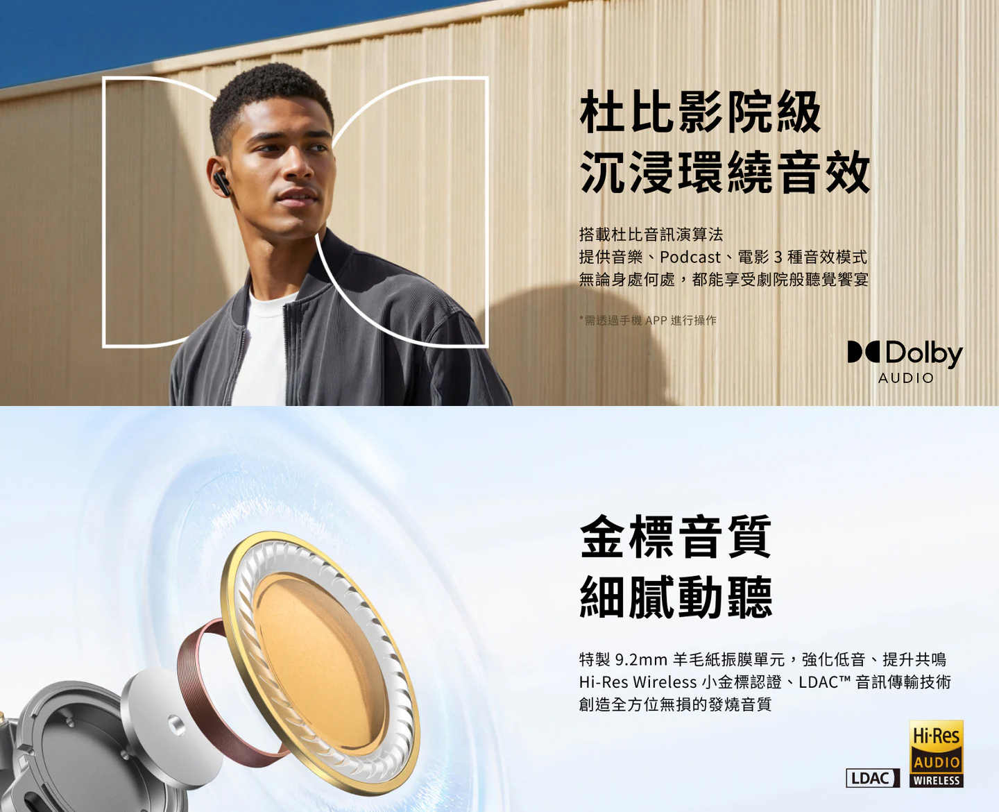 特製 9.2mm 羊毛紙振膜單元,通過 Hi-Res Wireless 小金標認證與 LDAC™ 音訊編碼,帶來近乎無損的發燒音質