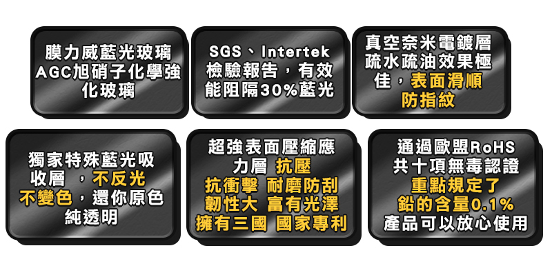 採用AGC頂級龍跡玻璃材質,硬度為一般玻璃6倍