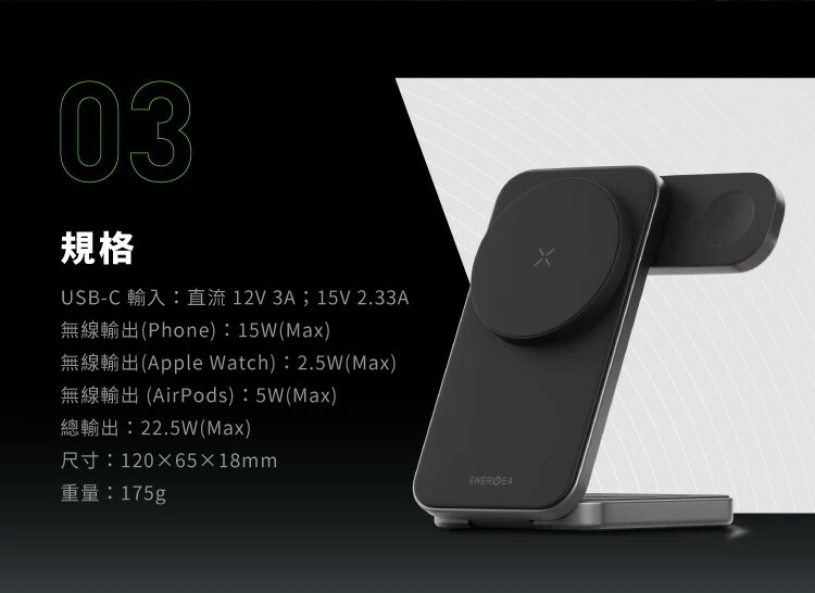 三合一無線充電站:手機、耳機、手錶多設備一次充滿電。